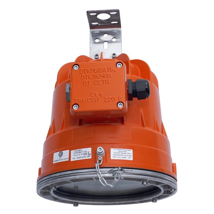 светильник поставляется с одним кабельным вводом и одной пробкой для тупикового монтажа, с универсальной скобой подвеса, без решётки и без отражателя.