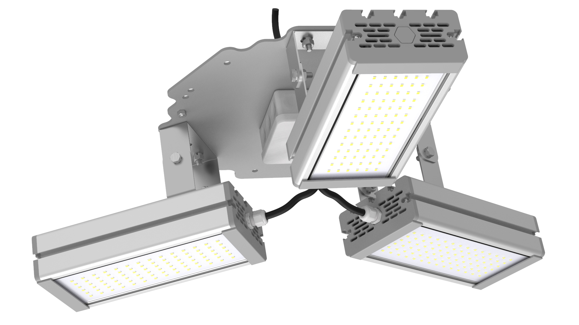 Подвесные промышленные светильники класса High-Bay с креплением на трос в 1 точке. Защита от 380В. Каждая секция имеет регулировку наклона.